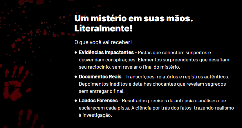 Você recebe mais de 100 casos misteriosos para resolver com seu parceiro(a), família ou amigos. Cada caso apresenta pistas, armadilhas e reviravoltas e o desafio é descobrir a verdade juntos.